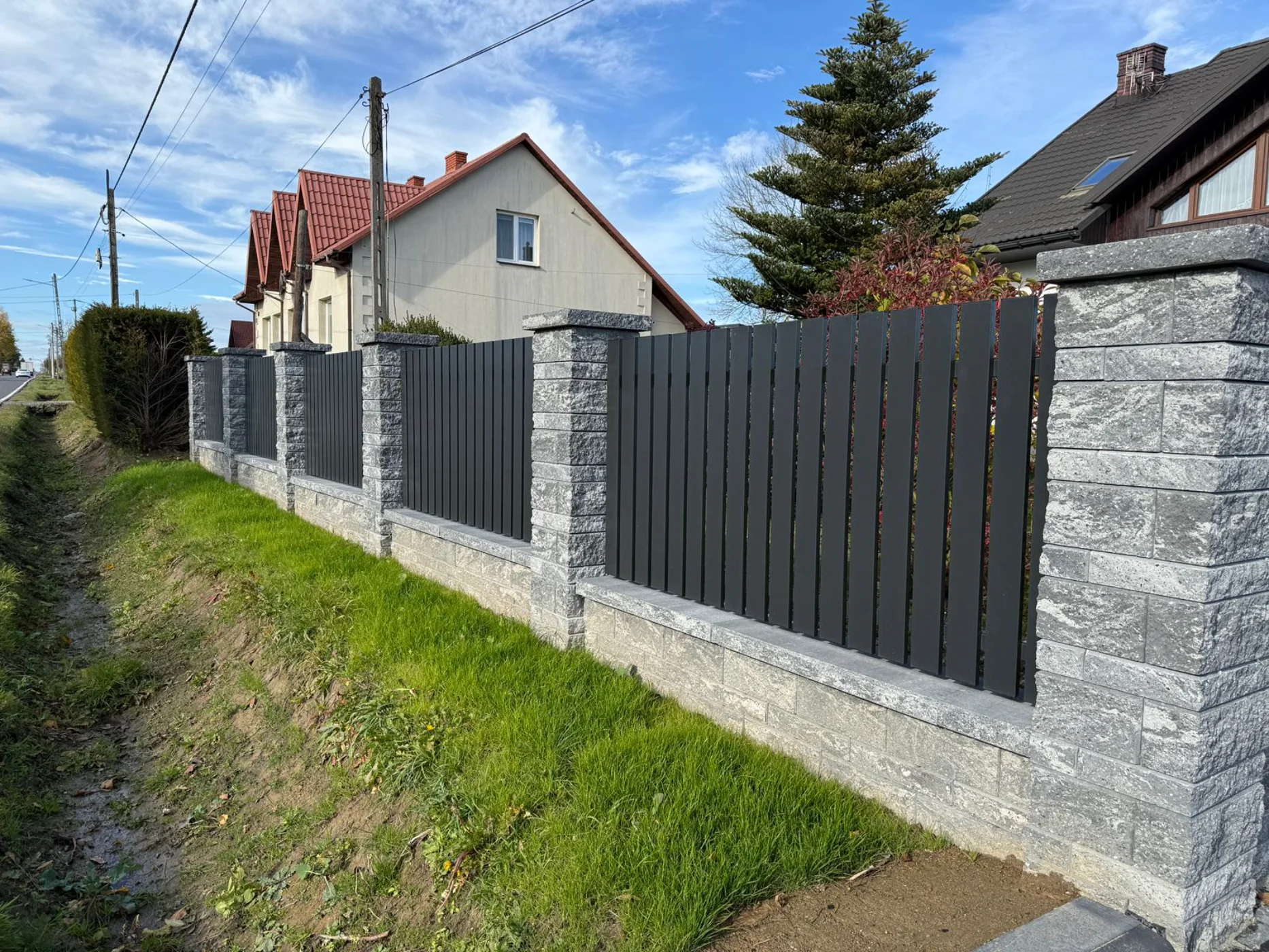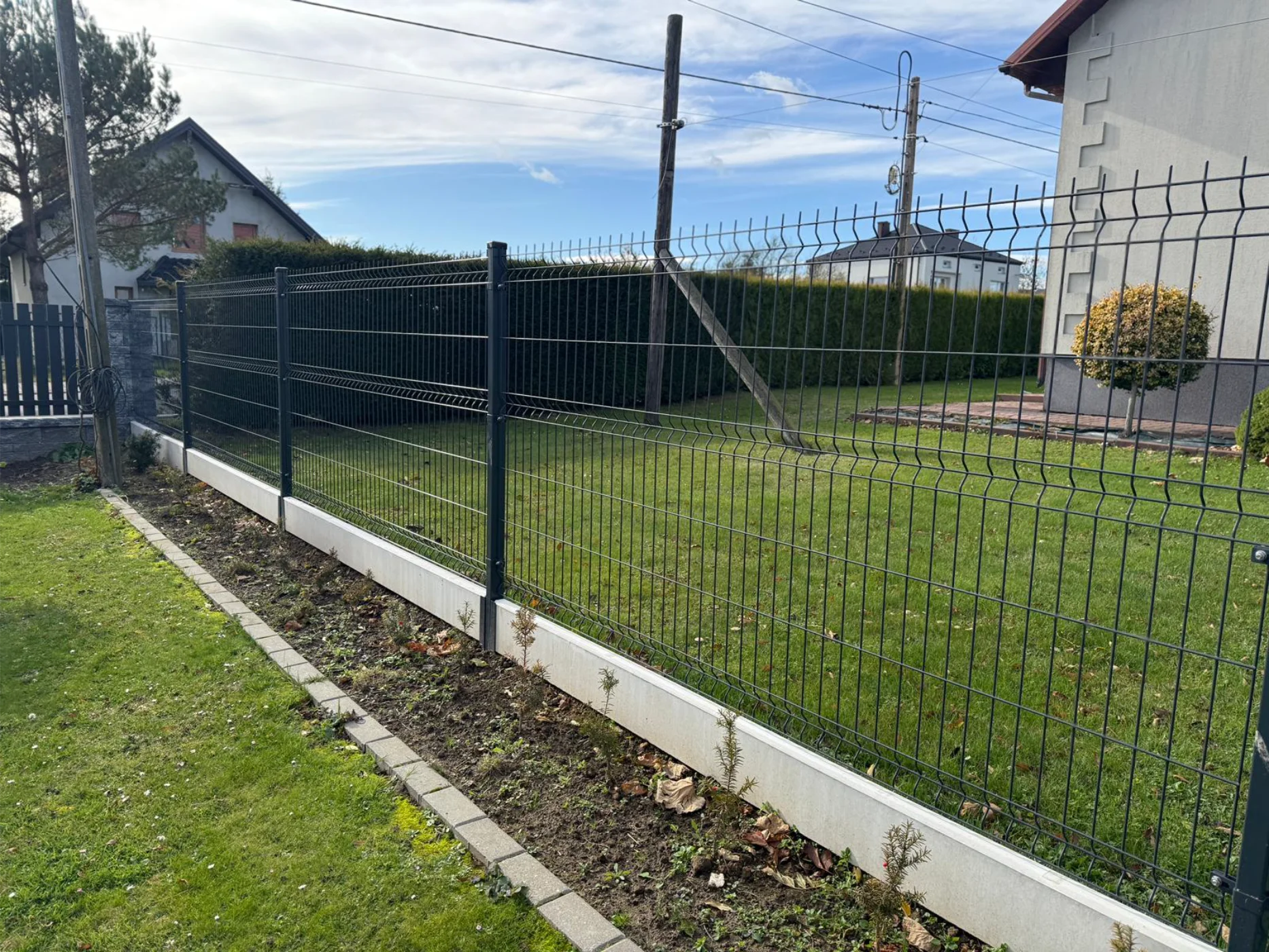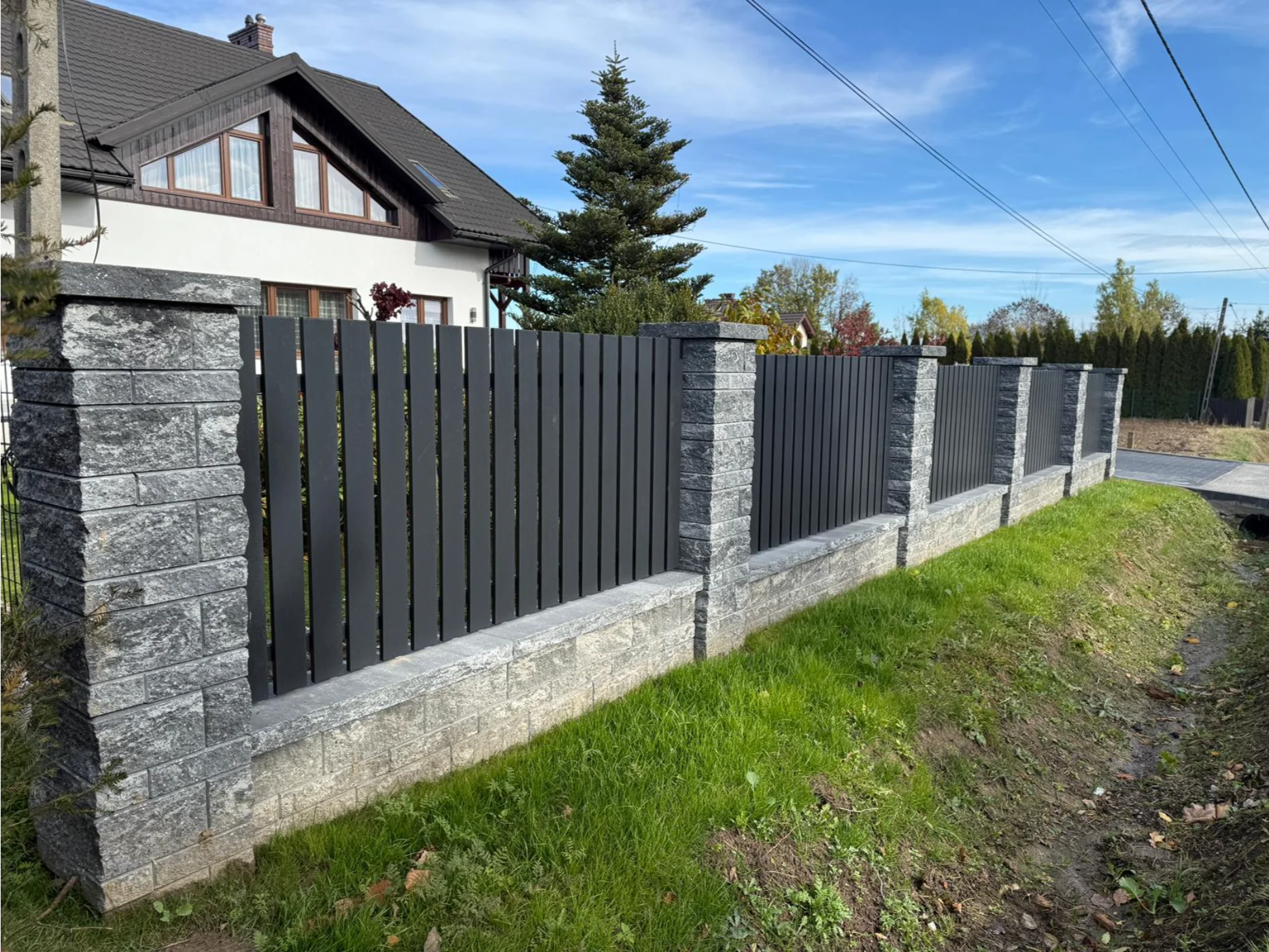 Ogrodzenie w okół domu, połączenie palisadowego, bloczków ogrodzeniowych i panelówki