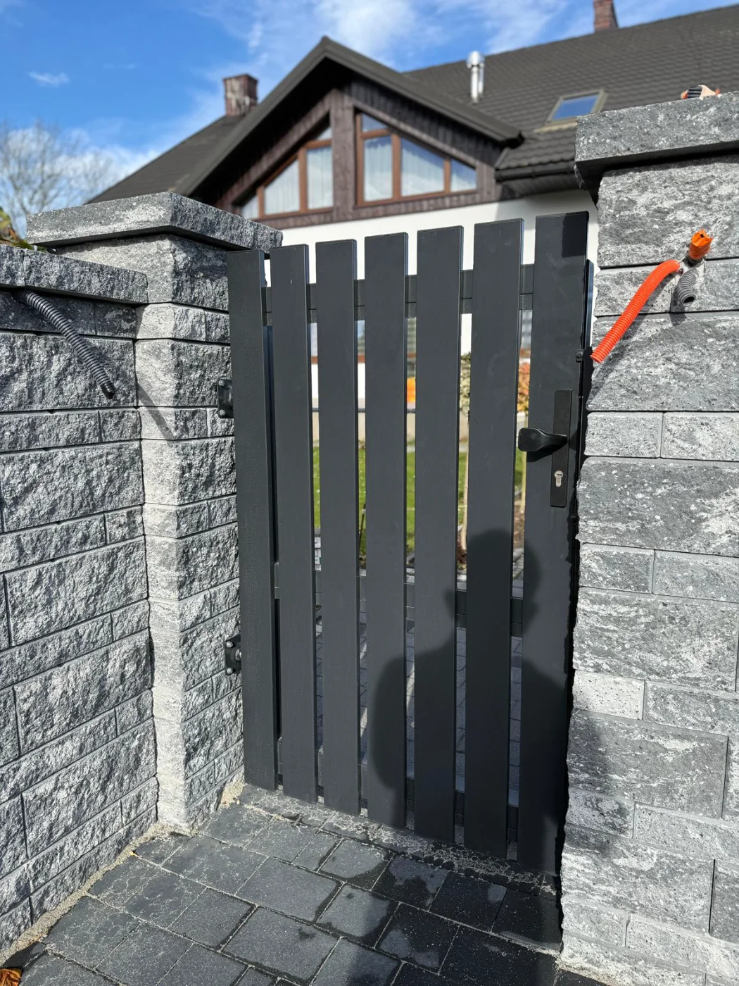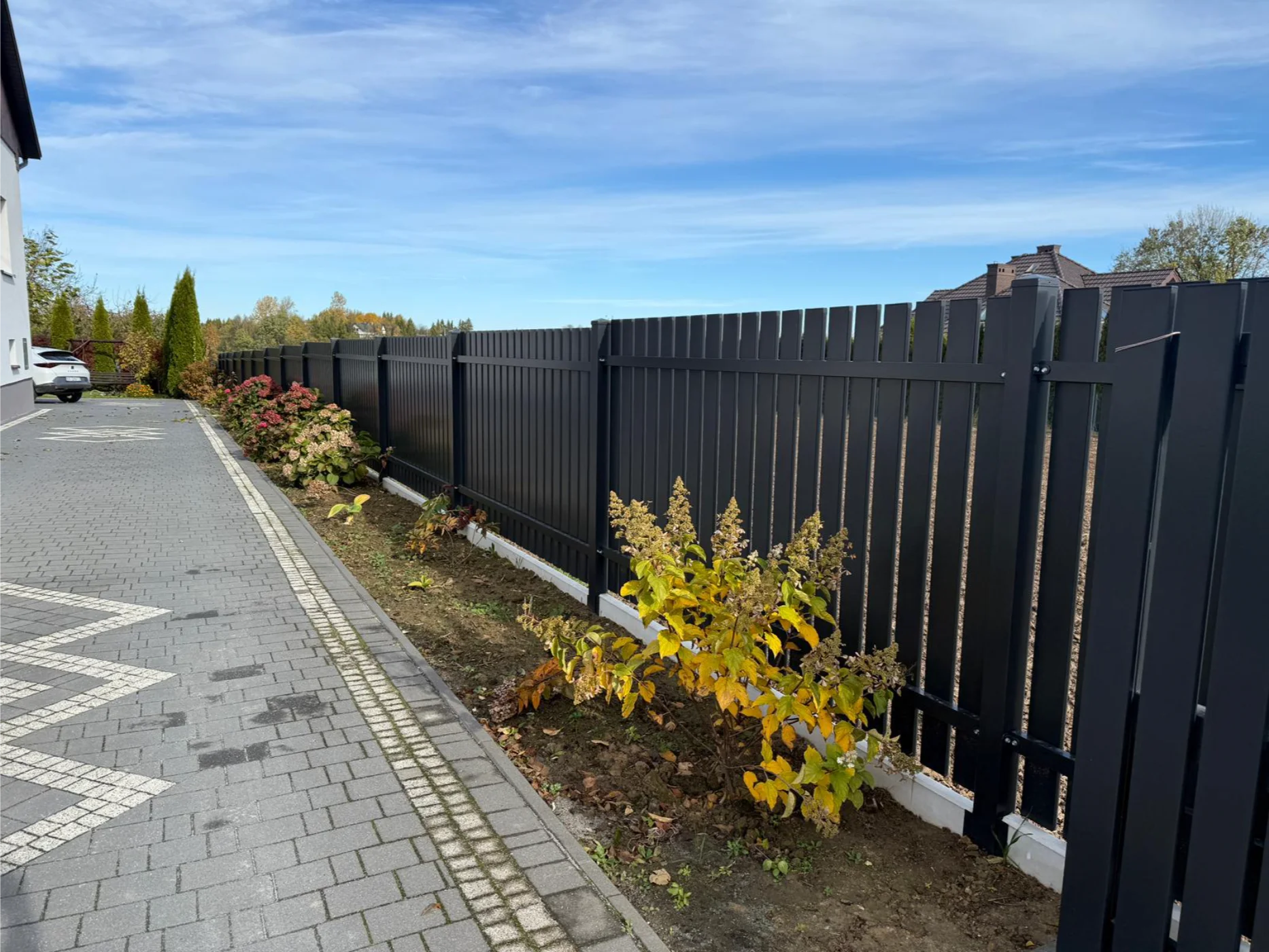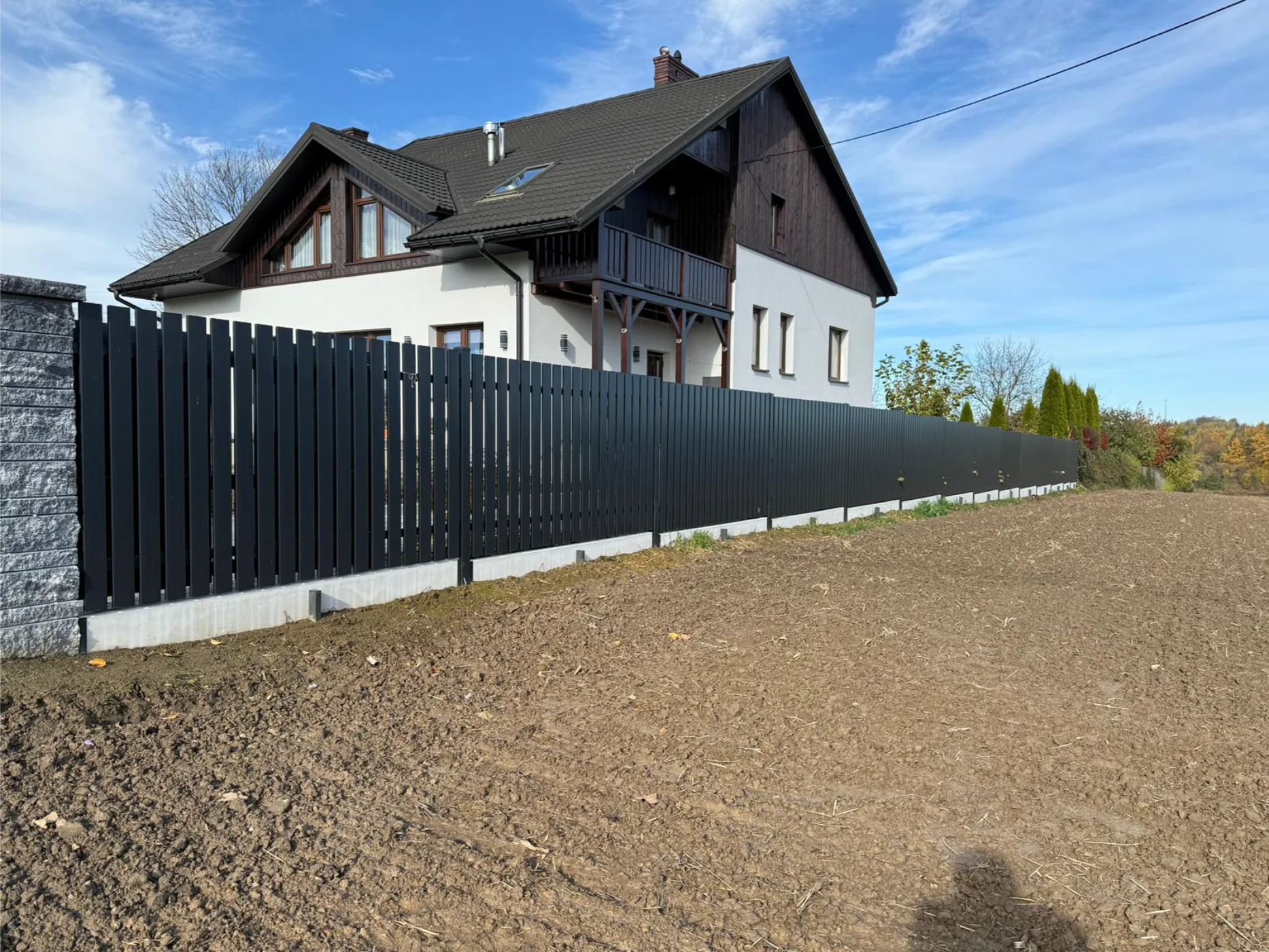 Ogrodzenie w okół domu, połączenie palisadowego, bloczków ogrodzeniowych i panelówki